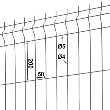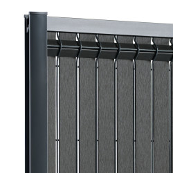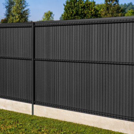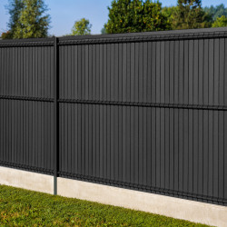 8 panneaux rigides fil Ø4/5gris 7016 H1m53, 8 plaques soubassement béton droite H 25cm, 9 poteaux renforcés gris 7016 H2m20, 2 sachets de fixations, 8 kits d'occultation lattes composite